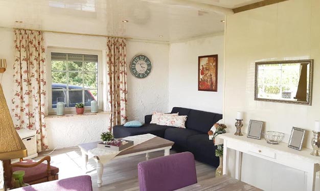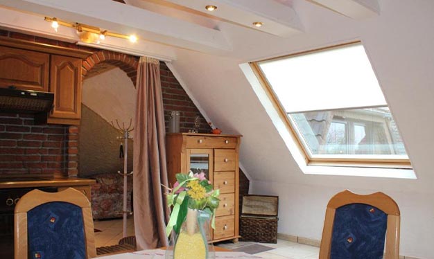 Dankzij de vele ramen en dakramen is er veel lichtinval en prachtig uitzicht over de landerijen.