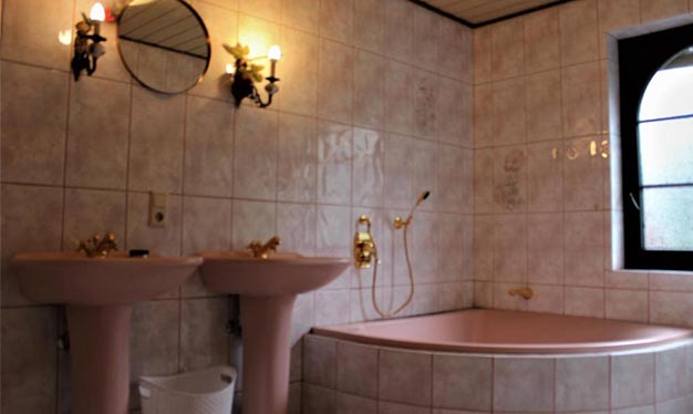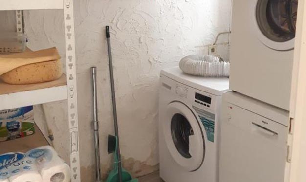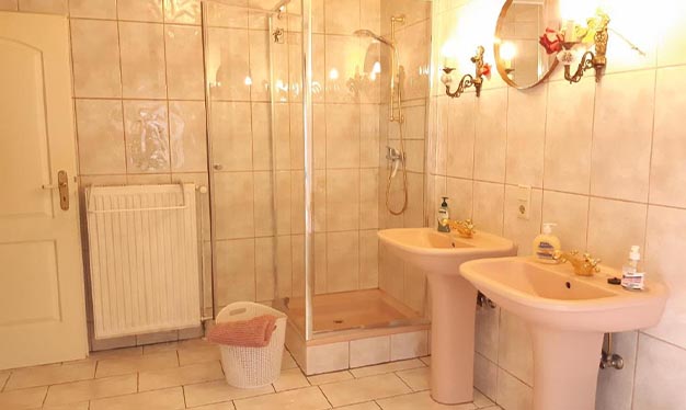 Durch eine Verbindungstür betreten Sie ein Schlafzimmer für 1 Person, einen Ruhebereich, einen Hauswirtschaftsraum, ein großes Schlafzimmer, ein Badezimmer mit Duschkabine und geräumiger Badewanne, Doppelwaschbecken und WC.